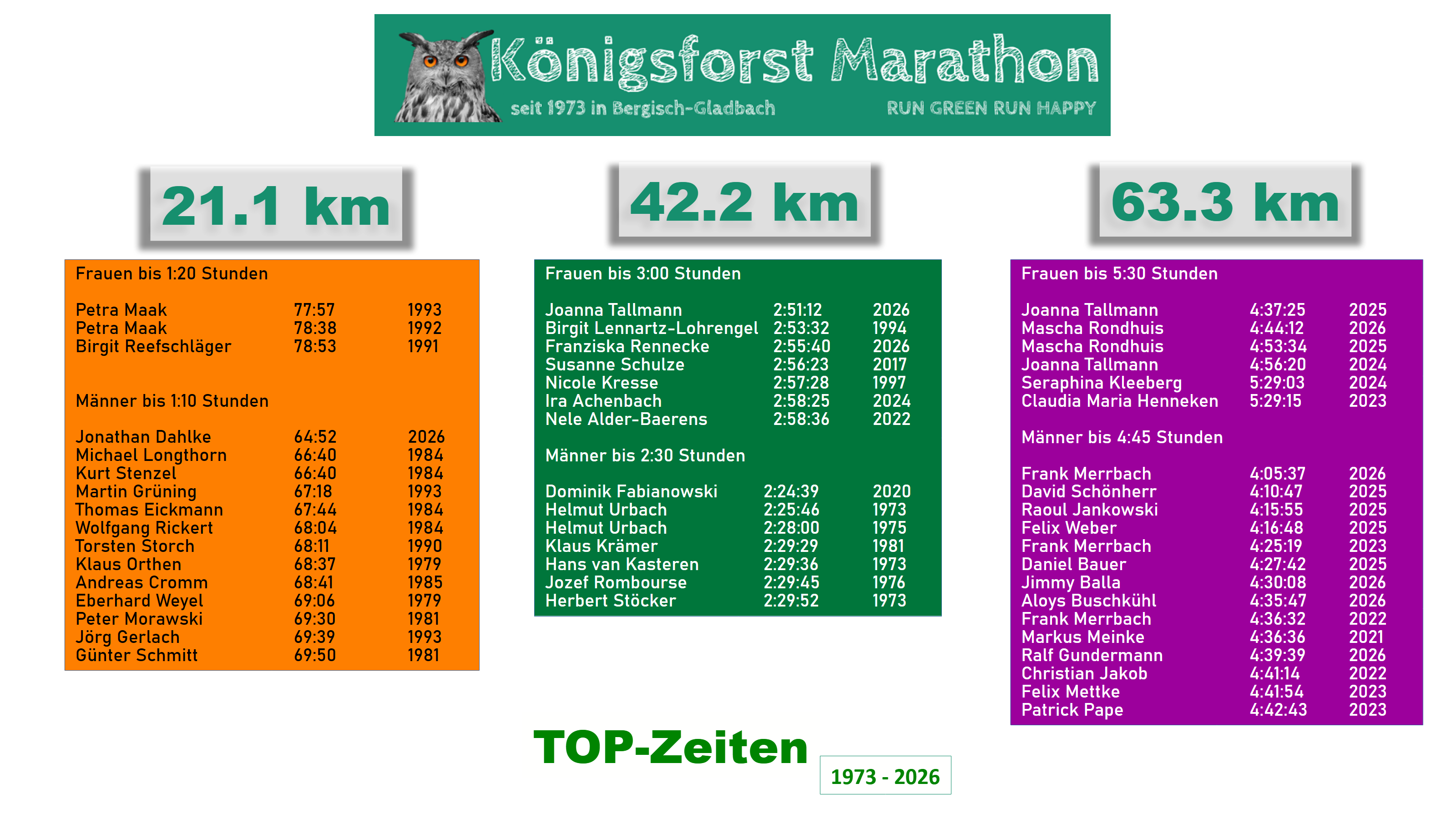 • Bei den Männern ging es über Adelin Staelens (1976) und Klaus Orthen (1979) zu Kurt Stenzel und Michael Longthorn (1984). 2026 verbesserte Jonathan Dahlke ihn auf 64:52min.